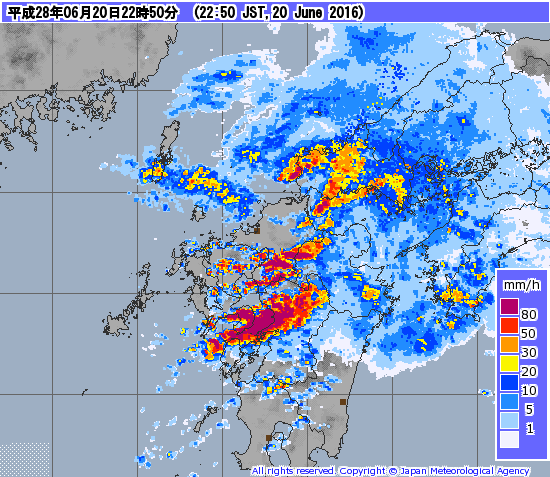 気象庁のレーダー解析によると、20日22:10までの1時間に、長崎県雲仙岳で115mmの猛烈な雨が降った模様です。気象庁は長崎県に記録的短時間大雨情報を発表し、今後の雨に対して警戒するよう呼びかけています。周辺地域では、土砂災害、低地の浸水、河川の増水や氾濫、落雷や突風といった天候の急変に厳重な警戒が必要です。また、悪天候に伴う交通機関への影響なども懸念されますので、今後の警報や注意報、気象情報に留意してください。