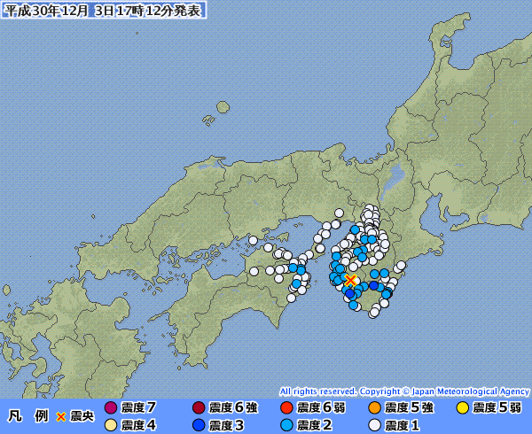 震源地は、和歌山県南部(北緯33.9度、東経135.4度)で、震源の深さは約50km、地震の規模(マグニチュード)は4.1と推定されます。