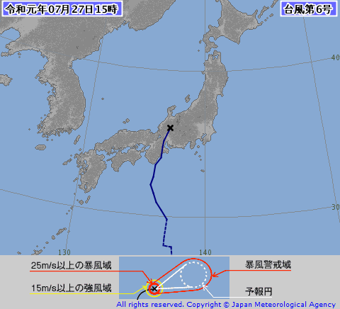 台風6号は27日(土)15時に岐阜県付近で熱帯低気圧に変わりました。中心付近には依然として発達した雲を伴っているものの、風は弱まってきています。