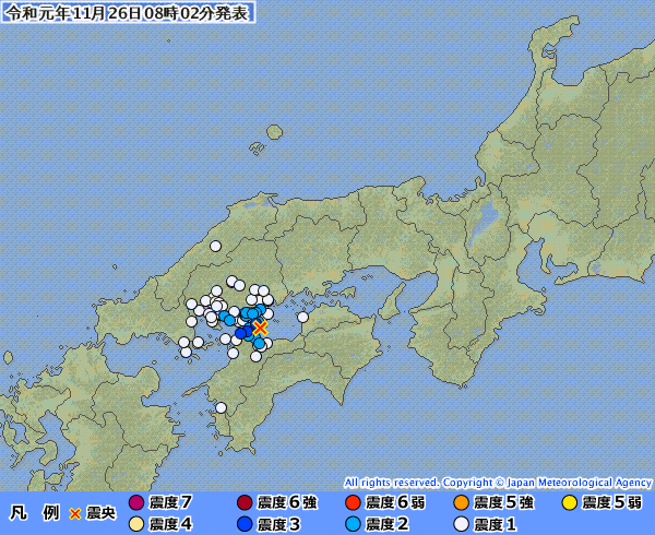 2019年11月26日 7時58分ごろ 瀬戸内海中部 3.8 3