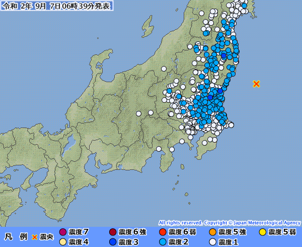 【最大震度3】(気象庁速報)2020年9月7日06時34分発生 震度3 福島県中通り 茨城県北部