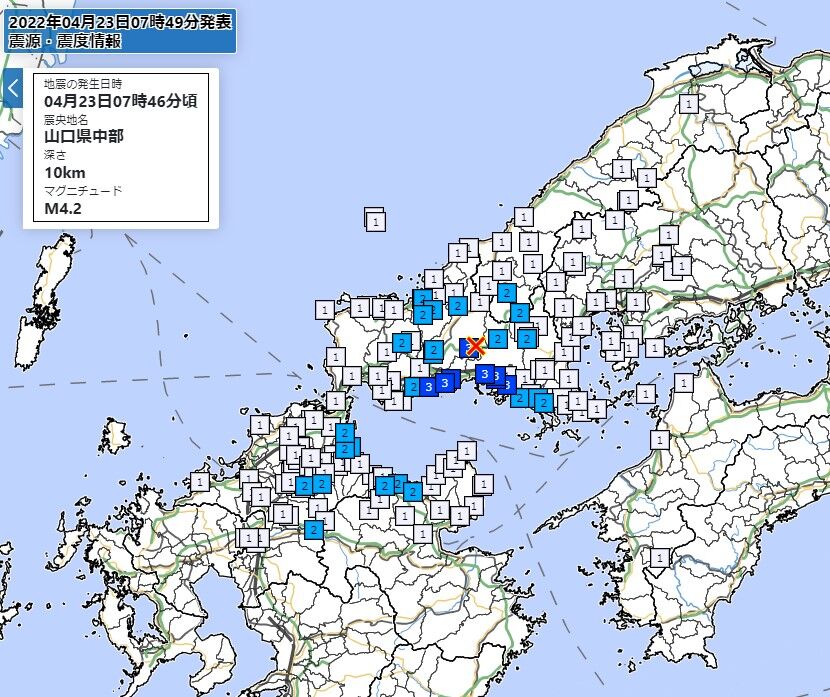 震源地は、山口県中部(北緯34.2度、東経131.7度)で、震源の深さは約10km、地震の規模(マグニチュード)は4.2と推定されます。